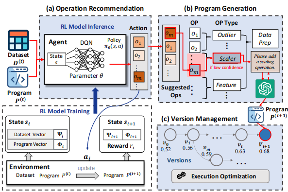 问题解决:为了解决这个问题,ChatPipe采用了强化学习(Reinforcement Learning, RL)的方法。具体来说,ChatPipe将操作推荐问题建模为一个序列决策过程,通过离线训练学习如何推荐操作。在推理阶段,给定数据集和当前程序,ChatPipe使用训练好的模型来推荐最合适的操作。