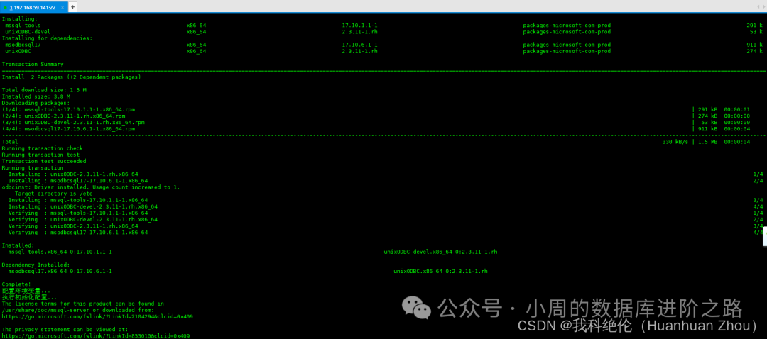 [root@localhost ~]# rpm -ivh mssql-tools-17.10.1.1-1.x86_64.rpm、unixODBC-devel-2.3.11-1.rh.x86_64.rpm、msodbcsql17-17.10.6.1-1.x86_64.rpm、unixODBC-2.3.11-1.rh.x86_64.rpm
