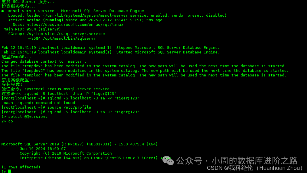 #!/bin/bashset -euo pipefail# 检查root权限if [[ $EUID -ne 0 ]]; thenecho "此脚本必须以root权限运行"exit 1fi# 用户输入配置read -p "请输入SA用户密码:" SA_PASSWORDread -p "选择SQL版本 (默认: Enterprise) [Evaluation/Developer/Express/Standard/Enterprise]:" SQL_EDITIONSQL_EDITION=${SQL_EDITION:-Enterprise}# 安装依赖#配置本地离线yum源,iso必须挂载cd etc/yum.repos.d/rm -rf ./*cat <<EOF > etc/yum.repos.d/local.repo[centos]name=centosbaseurl=file:///mntgpgcheck=0enabled=1EOFmount dev/sr0 mntyum clean all && yum makecacheyum --setopt=assumeyes=1 install bzip2 libsss_nss_idmap gdb lsof cyrus-sasl cyrus-sasl-gssapi libatomic python3 -ysleep 20# 添加微软YUM源echo "正在配置YUM源..."cd etc/yum.repos.d/rm -rf ./*curl -o etc/yum.repos.d/mssql-server-2019.repo https://packages.microsoft.com/config/rhel/7/mssql-server-2019.repocurl -o etc/yum.repos.d/msprod.repo https://packages.microsoft.com/config/rhel/7/prod.repo# 刷新YUM缓存yum clean allyum makecache# 安装核心组件echo "正在安装SQL Server..."yum install -y mssql-server# 安装工具集echo "正在安装工具组件..."ACCEPT_EULA=Y yum install -y mssql-tools unixODBC-devel# 设置环境变量echo "配置环境变量..."cat << EOF >> etc/profile.d/mssql.shexport PATH="/opt/mssql-tools/bin:\$PATH"EOFsource etc/profile.d/mssql.sh# 初始化配置echo "执行初始化配置..."MSSQL_SA_PASSWORD=$SA_PASSWORD \MSSQL_PID=$SQL_EDITION \ACCEPT_EULA=Y \SQL_INSTALL_AGENT=Y \/opt/mssql/bin/mssql-conf -n setup# 创建数据目录echo "配置存储目录..."DATA_DIR="/data/mssql/1433"mkdir -p ${DATA_DIR}/{database,dbbackup,dump,tempdb}chown -R mssql:mssql ${DATA_DIR}chmod -R 750 ${DATA_DIR}# 基础配置echo "应用基础配置..."systemctl enable mssql-server.servicesystemctl restart mssql-server.servicesleep 20/opt/mssql/bin/mssql-conf set filelocation.defaultdatadir ${DATA_DIR}/database/opt/mssql/bin/mssql-conf set filelocation.defaultlogdir ${DATA_DIR}/database/opt/mssql/bin/mssql-conf set filelocation.defaultbackupdir ${DATA_DIR}/dbbackup/opt/mssql/bin/mssql-conf set filelocation.defaultdumpdir ${DATA_DIR}/dump/opt/mssql/bin/mssql-conf set memory.memorylimitmb 3000/opt/mssql/bin/mssql-conf set hadr.hadrenabled true/opt/mssql/bin/mssql-conf set sqlagent.enabled trueecho "重启 SQL Server 服务..."systemctl restart mssql-server.service# 检查服务状态echo "检查服务状态..."systemctl status mssql-server.service# 等待服务启动sleep 10# 配置TempDB路径echo "配置TempDB..."/opt/mssql-tools/bin/sqlcmd -S localhost -U sa -P "$SA_PASSWORD" << EOFUSE master;GOALTER DATABASE tempdb MODIFY FILE (NAME = tempdev, FILENAME = '${DATA_DIR}/tempdb/tempdb.mdf');ALTER DATABASE tempdb MODIFY FILE (NAME = tempdev2, FILENAME = '${DATA_DIR}/tempdb/tempdb2.ndf');ALTER DATABASE tempdb MODIFY FILE (NAME = templog, FILENAME = '${DATA_DIR}/tempdb/templog.ldf');GOEOF# 应用高级配置echo "应用高级配置..."/opt/mssql-tools/bin/sqlcmd -S localhost -U sa -P "$SA_PASSWORD" << EOFEXEC sp_configure 'show advanced options', 1;RECONFIGURE;EXEC sp_configure 'contained database authentication', 1;EXEC sp_configure 'backup checksum default', 1;EXEC sp_configure 'backup compression default', 1;EXEC sp_configure 'blocked process threshold (s)', 5;EXEC sp_configure 'max degree of parallelism', 2;RECONFIGURE;EOF# 最终重启systemctl restart mssql-server.serviceecho "安装完成!"echo "验证命令:systemctl status mssql-server.service"echo "连接命令:sqlcmd -S localhost -U sa -P '$SA_PASSWORD'"