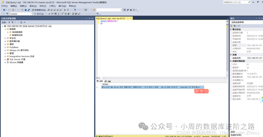 用Microsoft SQL Server Management Studio远程登录,执行命令查看版本