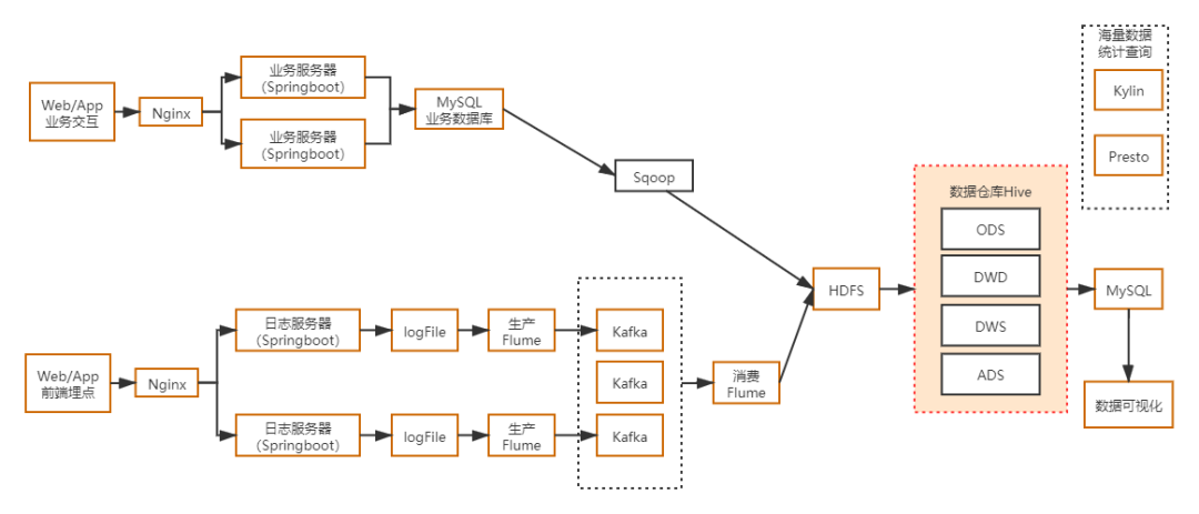 下面我们以某电商数据仓库的技术架构搭建为样例,来学习了解大数据数仓的技术应用。其中根据实际情况,用到了大数据应用的主要技术栈,供大家整体了解应用的方方面面。