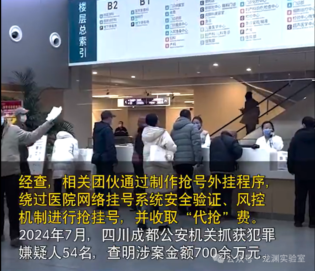 2023 年 1 月以来,多个犯罪团伙在社交平台发布代抢某三甲医院专家号源的广告。经查,相关团伙通过制作抢号外挂程序,绕过医院网络挂号系统安全验证、风控机制进行抢挂号,并收取 “代抢” 费。2024 年 7 月,四川成都公安机关抓获犯罪嫌疑人 54 名,查明涉案金额 700 余万元。