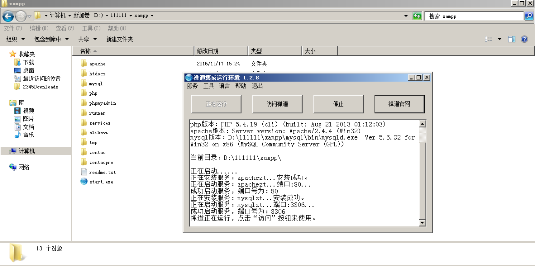 1.测试环境下载地址:https://www.zentao.net/download/80035.html,下载完成以后点击进行安装操作2.安装成功后会在D:\111111\下面生成一个xampp的文件夹3.进入xampp文件夹,点击start.exe文件,点击“启动”按钮,显示正在运行。