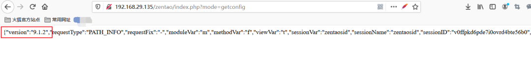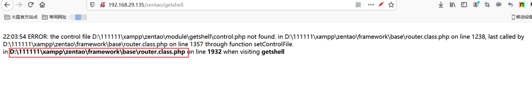 5.输入网址:http://192.168.29.135/进行访问搭建的禅道网站6.访问该路径:http://192.168.29.135/zentao/index.php?mode=getconfig,获取版本号为9.1.2,该版本存在免登陆的SQL注入漏洞1.随便访问一个不存在的路径http://192.168.29.135/zentao/getshell,会出现报错,报错回显出文件的存放路径为D:\111111\