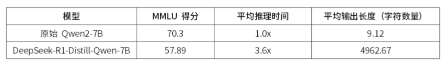 可以看到,蒸馏后的模型在 MMLU 上得分有下降,推理时间也有显著的延长。