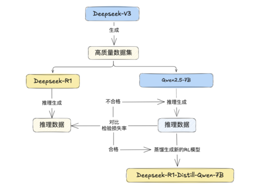 因为Deepseek-R1的参数量非常大,部署要求非常高,为了在小参数模型中引入长思维链推理能力,DeepSeek 团队引入了蒸馏技术。模型蒸馏就像是一场知识的传承,我们以 Deepseek-R1-Distill-Qwen2.5-7B 为例简单阐述蒸馏过程。