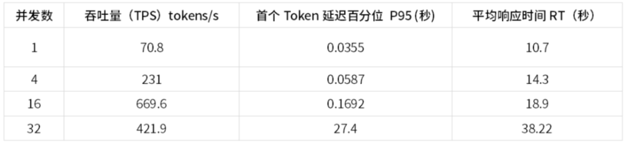 根据本次的测试数据,在16并发时,模型推理的吞吐量达到最大值,每个用户可以获得约 42 tokens/秒的速度,且首字符延迟在0.2秒以内。