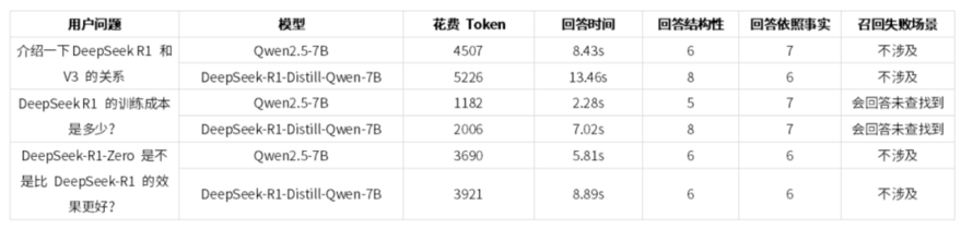 不 完全适合 RAG: 从 MMLU 得分我们可以发现,蒸馏后的推理模型在事实性问题得分反而下降,在 RAG 测试中也一定程度上复现了这一问题,模型有时可能会过度推理导致偏离了事实,此外由于响应时间的增加,蒸馏版 7B 模型可能不完全适合 RAG 场景。