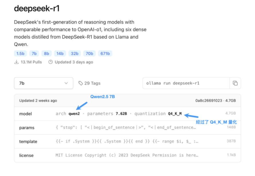 根据前文我们已经知道真正的 DeepSeek-R1 为 671B 参数的版本(网上也被称为“满血版”),很多网上教程的版本教大家通过 ollama run deepseek-r1 下载的其实是一个经过蒸馏加微调训练出来的 Qwen2.5 7B, 所以这个模型的“智力”和我们在 DeepSeek 官网上对话的模型会相差甚大,再仔细观察会发现这个模型只有 4.7GB,也就是说这是一个经过较大力度量化的模型,这对模型的“智力”无疑会进一步雪上加霜。
