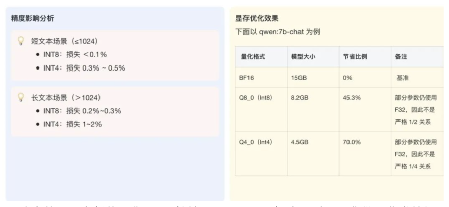 量化模型可以大幅减少显存占用和计算量, 使得在普通 GPU 甚至 CPU 上部署大型模型成为可能。然而,过度的量化可能导致模型精度的下降,特别是在处理需要精确计算和推理的任务时。