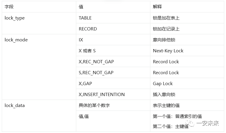 ENGINE|ENGINE_LOCK_ID |ENGINE_TRANSACTION_ID|THREAD_ID|EVENT_ID|OBJECT_SCHEMA|OBJECT_NAME|PARTITION_NAME|SUBPARTITION_NAME|INDEX_NAME|OBJECT_INSTANCE_BEGIN|LOCK_TYPE|LOCK_MODE|LOCK_STATUS|LOCK_DATA|