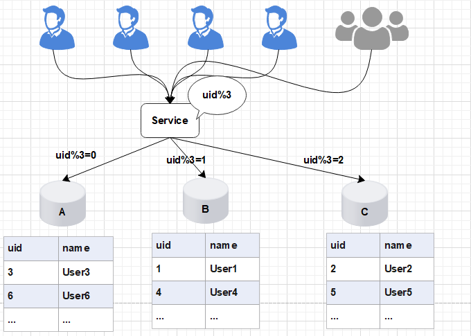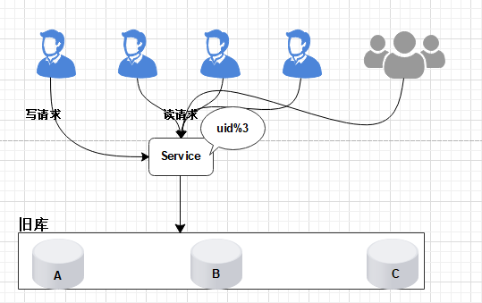 在项目初期,我们部署了三个数据库A、B、C,此时数据库的规模可以满足我们的业务需求。为了将数据做到平均分配,我们在Service服务层使用uid%3进行取模分片,从而将数据平均分配到三个数据库中。