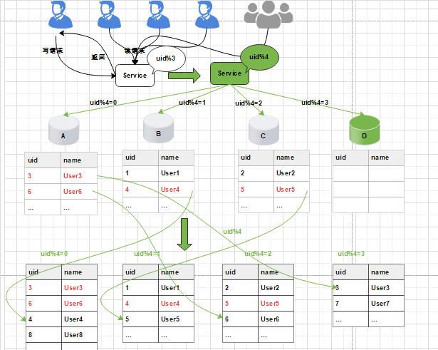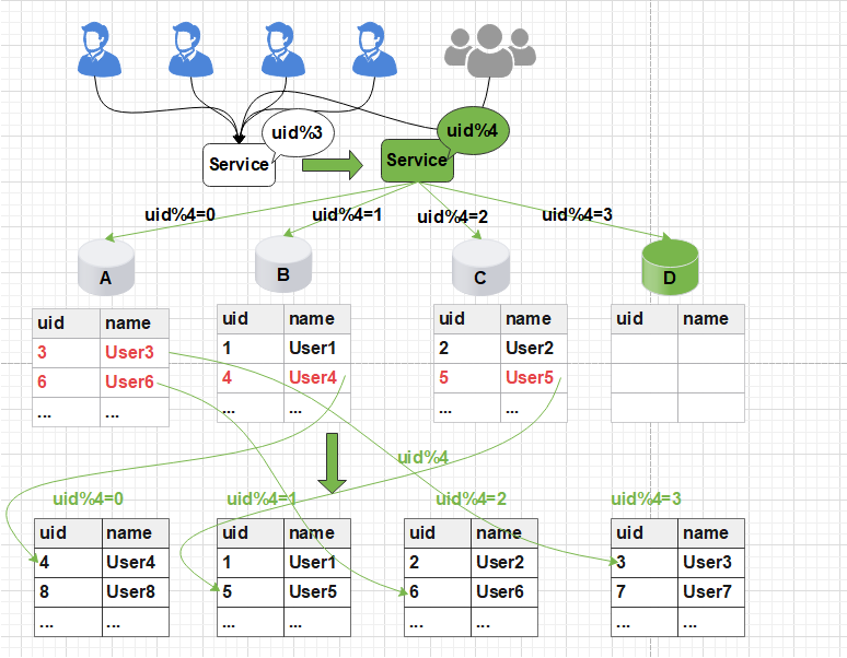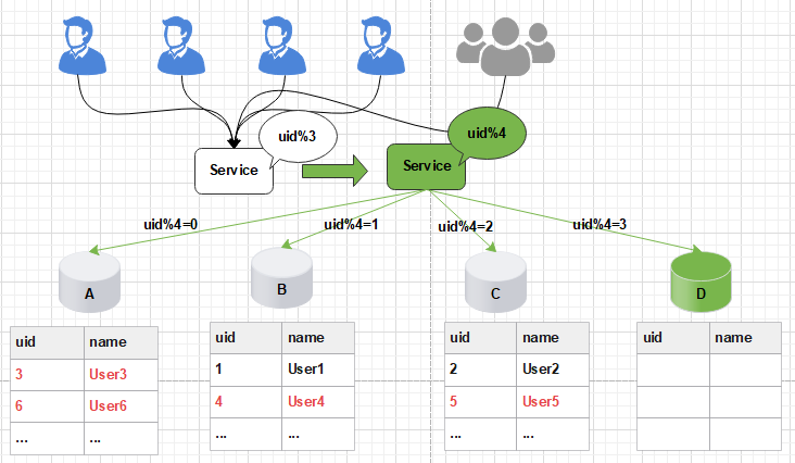 比如之前uid如果是uid=3取模3%3=0, 是分配在A库上,新加入D库后, uid=3取模3%4=3,分配在D库上;