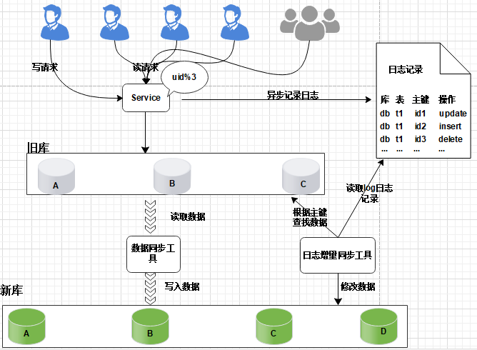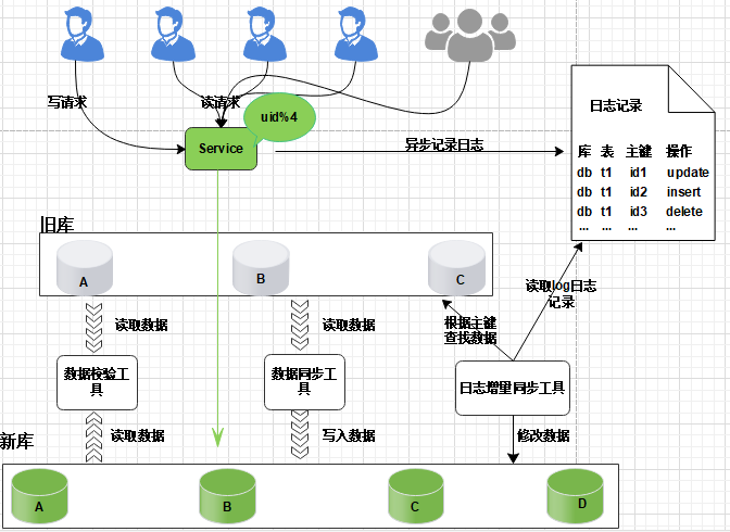 只对旧库进行读取操作, 如果同步出现问题, 都可以对新库进行回滚操作。