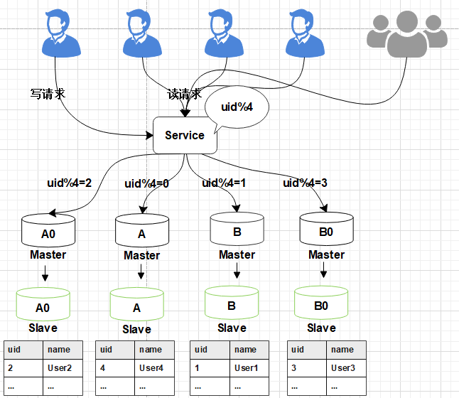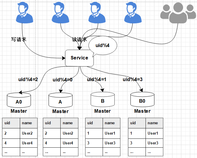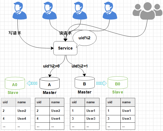把uid%4=0和uid%4=2的数据分别分配到A和A0主库中