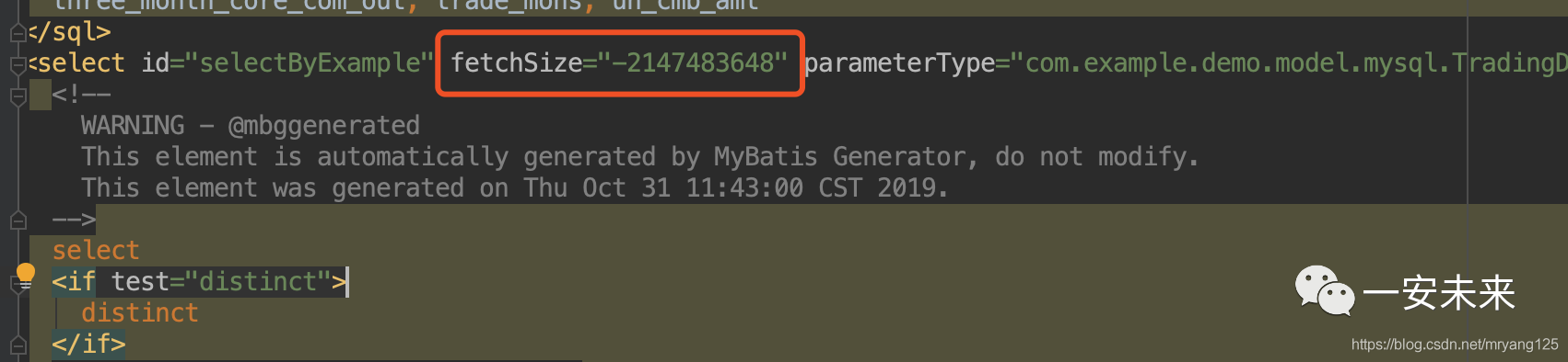 <select id="streamByExample" fetchSize="-2147483648" parameterType="com.alphathur.mysqlstreamingexport.domain.AuthorsExample" resultMap="BaseResultMap">