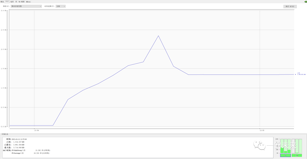 可以看出,下载开始前内存占用大概为几十M,下载开始后内存占用急速上升,峰值达到接近2.5G,即使是下载完成,堆内存也维持一个较高的占用,这实在是太可怕了,如果生产环境敢这么搞,不出意外肯定内存溢出。