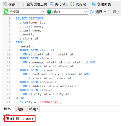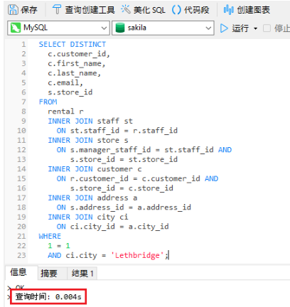 首先,以下是在 Sakila 示例数据库运行的查询,获取从 Lethbridge 商店租借电影的客户: