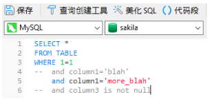 向已经具有 WHERE 1=1 的查询添加条件时,此后的所有条件都将包含 AND,因此在注释掉试验查询的条件时更容易。
