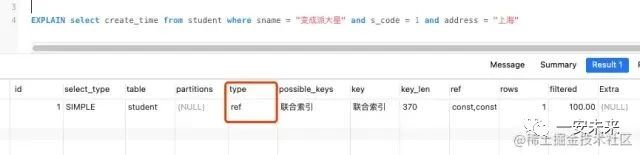 EXPLAIN select create_time from student where address = "上海" and s_code = 1 -- 会走索引吗?