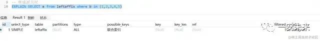 在 WHERE 子句中,如果在 OR 前的条件列是索引列,而在 OR 后的条件列不是索引列,那么索引会失效 举个例子,比如下面的查询语句,b 是主键,e 是普通列,从执行计划的结果看,是走了全表扫描。