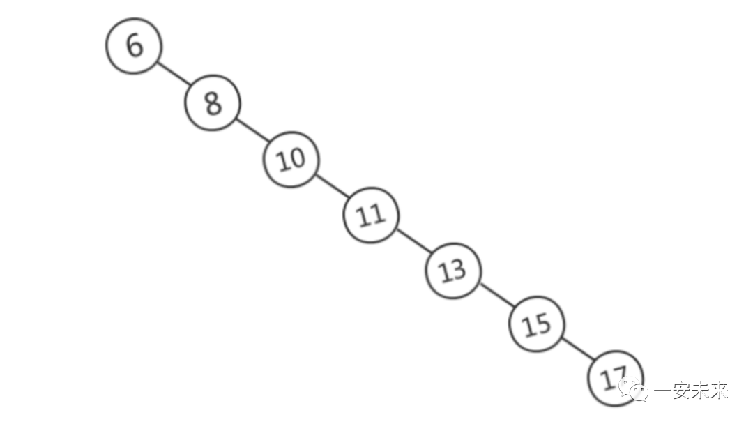 当需要快速查找时,将数据存储在 BST 是一种常见的选择,因为此时查询时间取决于树高,平均时间复杂度是O(lgn)。然而,BST 可能长歪而变得不平衡,如下图所示,此时 BST 退化为链表,时间复杂度退化为O(n)。