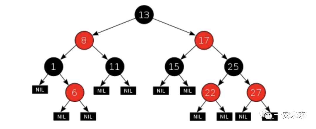 与 AVL 树相比,红黑树并不追求严格的平衡,而是大致的平衡:只是确保从根到叶子的最长的可能路径不多于最短的可能路径的两倍长。从实现来看,红黑树最大的特点是每个节点都属于两种颜色(红色或黑色)之一,且节点颜色的划分需要满足特定的规则(具体规则略)。红黑树示例如下: