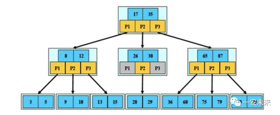 可以看出,B 树的定义,主要是对非叶结点的子节点数量和记录数量的限制。下图是一个 3 阶 B 树的例子: