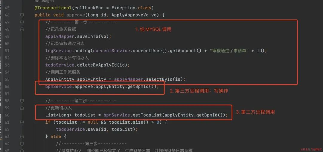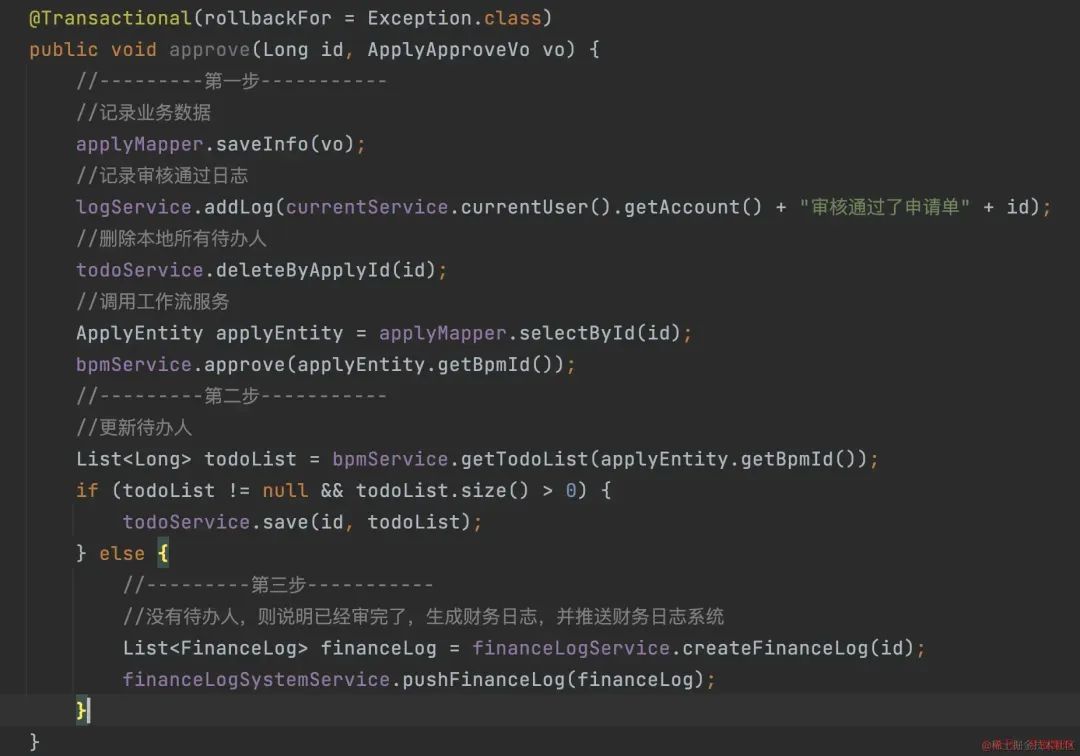 但如果1和2正常执行,操作3发生异常,操作1的数据会因为事务回滚,但操作2并不能。因此整个系统会出现一个很诡异的现象:单据系统内,没有任何日志记录,用户操作的数据也没有保留下来,但BPM那边却已经审核通过了,这在任何正常流程中,都是不可能出现的状态。