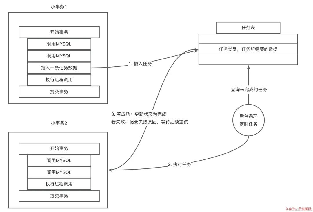 小事务内,尽量只有一个远程写操作 该远程写操作放到方法最后,保证在其返回成功后就能立刻提交事务 小事务可能会因为某些原因失败,因此需要机制来进行重试
