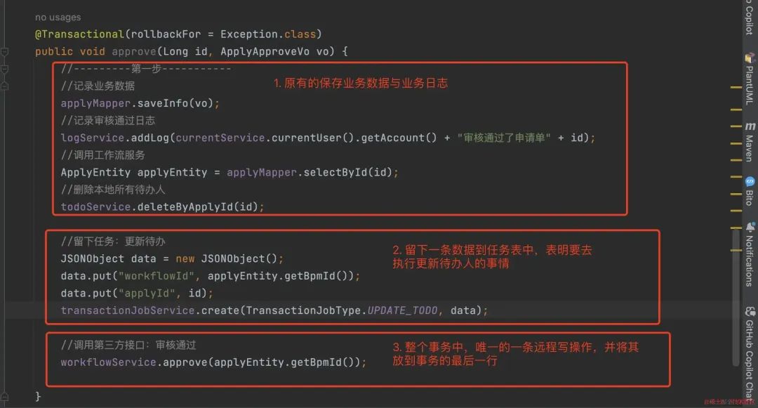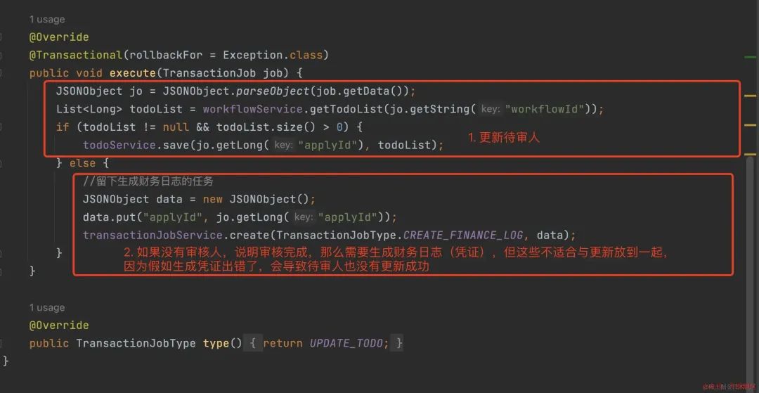 第三步,改造业务代码,不再一次性把流程写完,而且是在第一个小事务中,顺便往transaction_job