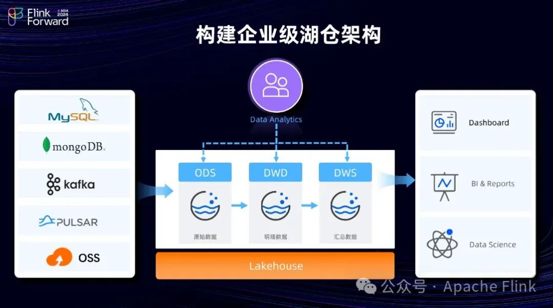 如今,数据湖(Data Lake)和湖仓一体(Lakehouse)的概念,以及像Paimon这样的技术栈,正变得越来越流行。理想的解决方案是以开放的数据湖格式作为核心,这种做法允许将多样化的数据源导入到统一的数据存储中。由于采用了开放格式,因此能够支持多种计算引擎,包括流处理、批处理、OLAP分析甚至是AI模型训练等任务。通过这种方式,可以对数据执行多维度的分析与处理,并最终将结果应用于人工智能应用、商业智能报告或其他数据分析场景中,从而帮助企业更好地挖掘其数据资产的价值。