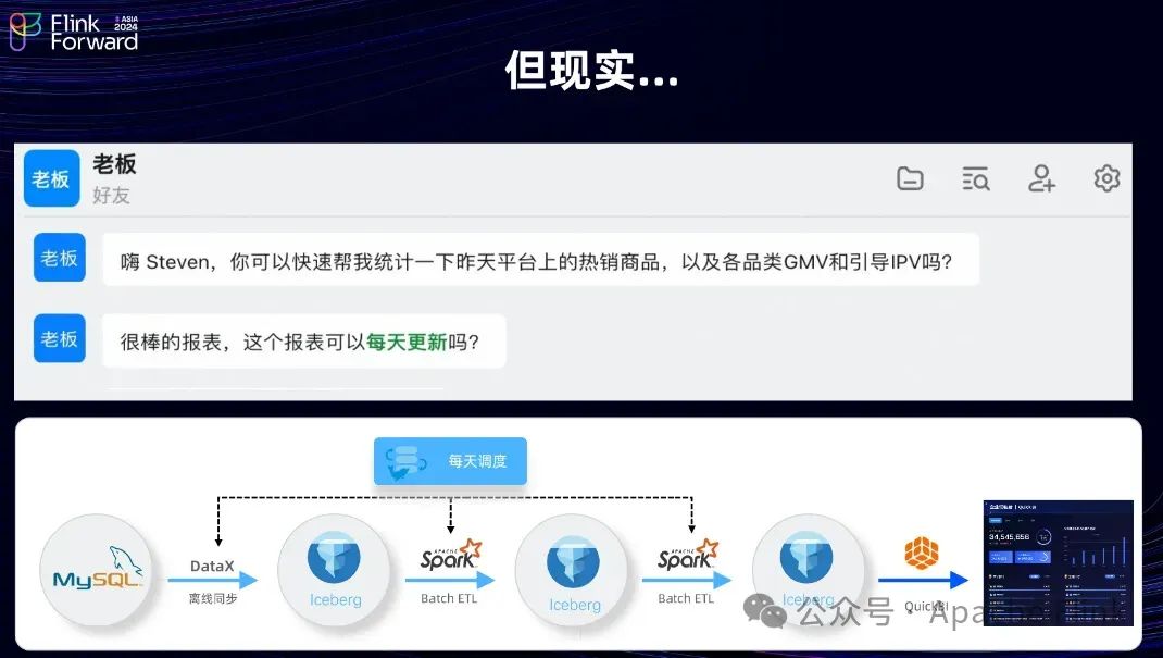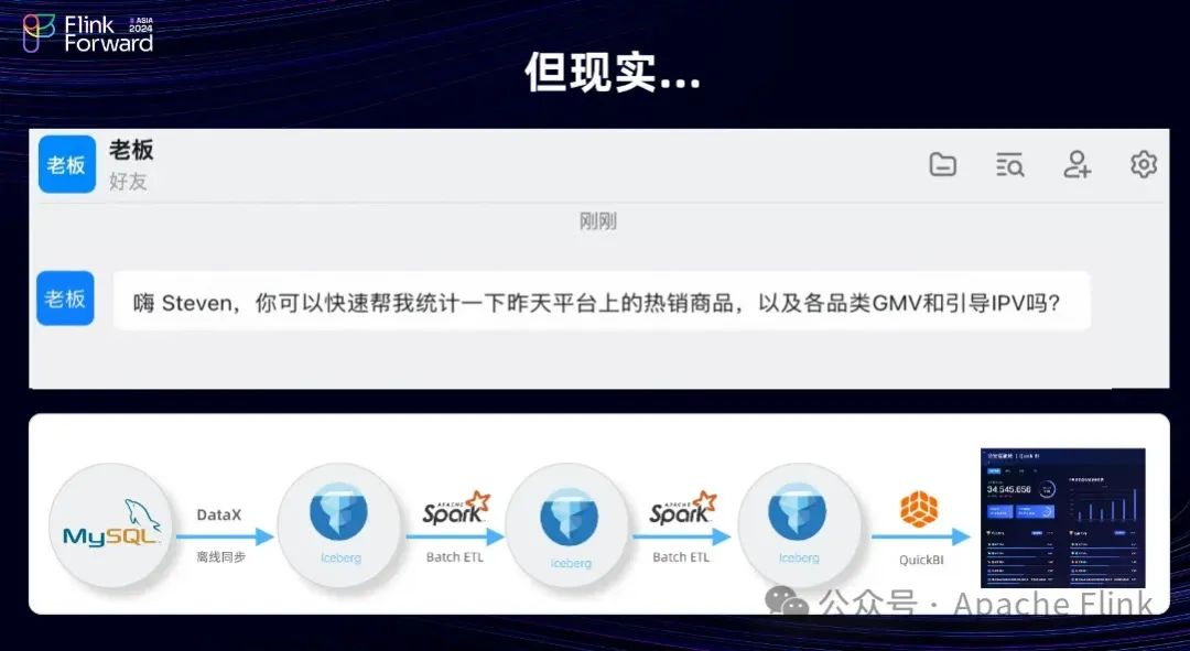 接下来我们可以从一个案例看一下:假设Steven是某公司的数据工程师,上班之后接收到老板的钉钉消息——“能不能统计下平台昨天的一个热销商品,或者一些各品类的 GMV?”,熟悉业务的 Steven选择 Iceberg作为它的数据湖存储,然后把数据从 MySQL 里面通过 DataX 导进来,导完之后用 Spark 做 Batch ETL ,然后通过 QuickBI 搭建一个很漂亮的大屏,老板看到大屏之后很满意。然后提出一个新的需求。