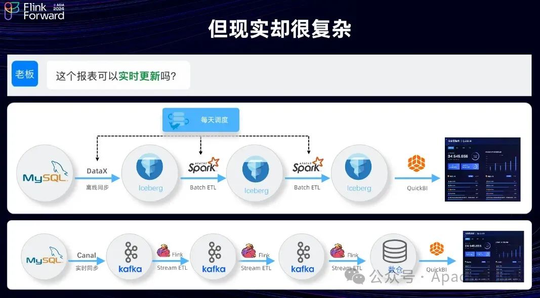 于是老板又期望报表每天都实时更新,Steven对Iceberg比较熟,知道 Iceberg 当前主要面向离线场景,在实时更新上可能有一些困难。Spark 或者 Spark SQL 很难做到一个秒级或分钟级的实时计算,在现有的统一的湖仓架构的链路上无法满足,这时候不得不搭建一套新的实时链路。比如用 Flink 加 Kafka 典型的组合完成一套实时的链路,然后重新搭建一套实时的 BI 大屏。这时候相当于引入实时和离线的两套链路,本质上就是一个 Lambda 的架构。