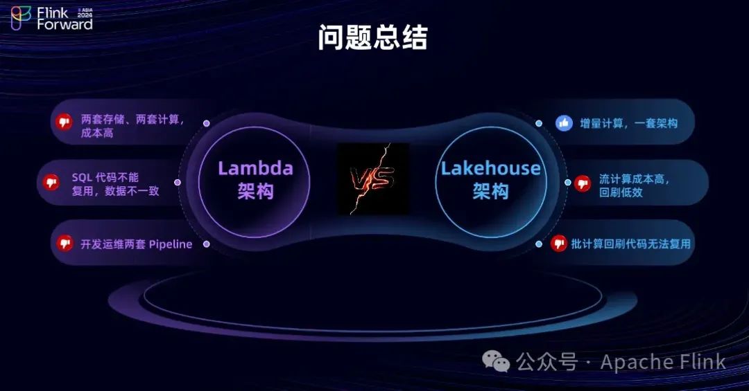 • 低效率:数据处理逻辑在批处理和流处理中需要分别实现,代码复用性差,开发和维护效率低下。