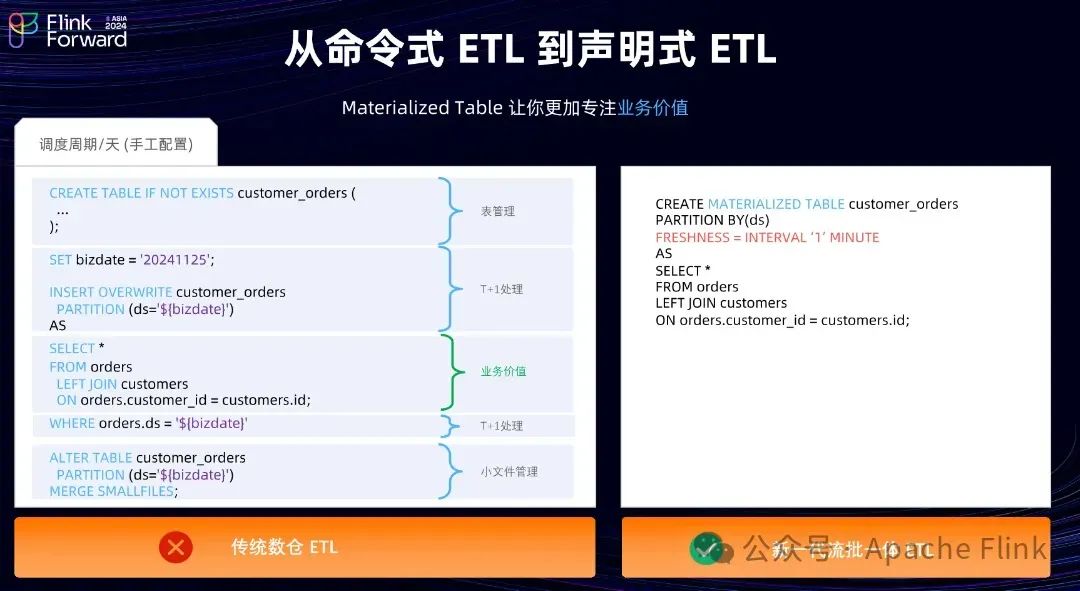 从刚才的介绍看,使用 Materialized Table 构建新一代流批一体 ETL,相比于传统的数仓里面或者离线调度场景里面 ETL 有什么区别,首先看在传统数仓里面的 ETL,写一个完整的 ETL 作业,大概分这么几个部分,第一个部分是创建一张表,第二部分需要声明数据的分区也就是数据的新鲜度,需要的是过去一天的还是过去一小时的数据。第三部分是声明业务价值的部分,就是业务逻辑部分,涉及到表的一些小文件管理等操作。然后配置一个调度的作业,周期性的实现数据的刷新,达到想要的新鲜度。使用 Materialized Table 之后,只需要声明一套 SQL,也就是数据新鲜度和业务逻辑,把其他的事情都交给引擎,Materialized Table 相当于可以让你更专注于业务价值部分,实现一套 API 统一流和批。