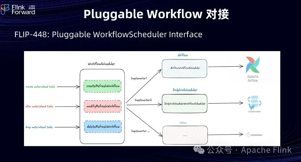 第二部分是和 Workflow 的对接。用户在创建CatalogMaterializedTable 时候指定的新鲜度,后台可能对应的是一个流作业,也可能是一个批作业。假如他是一个批作业,需要依赖一个工作流调度器创建对应的 Workflow,然后通过它的周期性调度完成数据刷新,这个时候需要一个插件和 Workflow 调度器对接,让 SQL Gateway 和对应的工作流调度器相互通信,把这些东西接上。基于上述需求,我们在 FLIP-448 里面抽象出一个插件化的 WorkflowScheduler接口。WorkflowScheduler 接口有三个方法:createRefreshWorkflow,modifyRefreshWorkflow 和deleteRefreshWorkflow。对 Materialized Table 做一些 CRUD 的操作的时候,需要通过 WorkflowScheduler 接口和具体的工作流调度器通信,完成对应的操作。比如使用 Airflow 就需要实现一个AirflowWorkflowScheduler,使用 DolphinScheduler 就需要实现一个 DolphinSchedulerWorkflowScheduler,或者其他公司自研的工作流调度器就需要对应的实现。