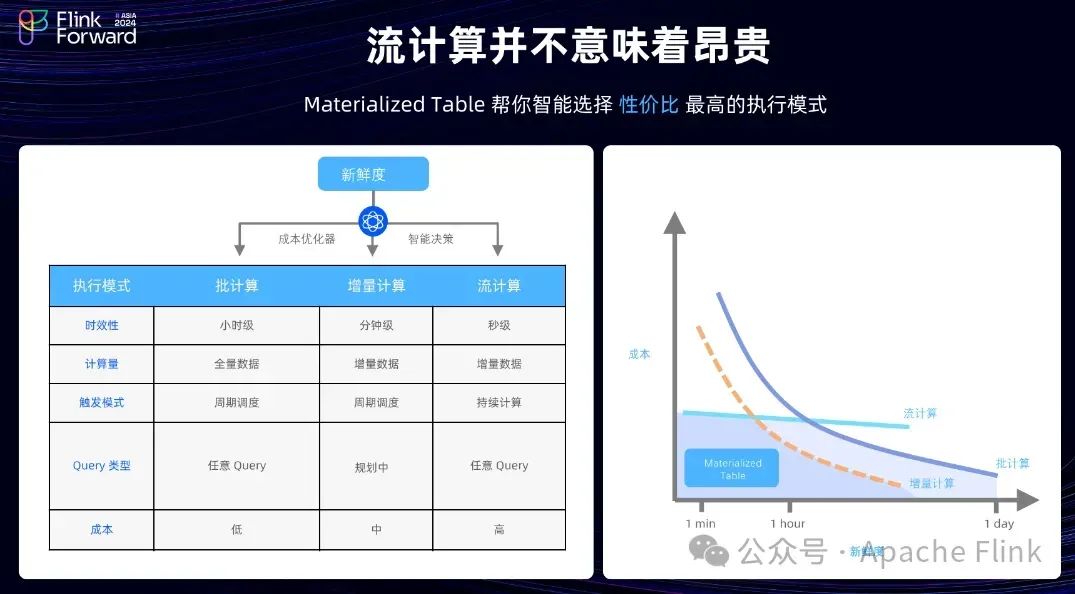 由于 Materialized Table 具备不同的计算能力,结合用户指定的 Freshness 以及成本优化器,会自动的选择一个最优的执行模式。这意味着 Materialized Table 能达到用户期望的成本和新鲜度的平衡,这也是用户层面最关心的事情。
