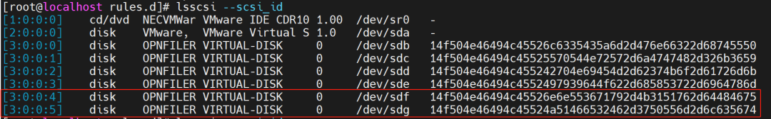 [root@localhost rules.d]# lsscsi --scsi_id