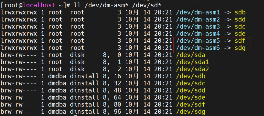 [root@localhost ~]# ll dev/dm-asm*lrwxrwxrwx 1 root root 3 10月 14 20:10 dev/dm-asm1 -> sdblrwxrwxrwx 1 root root 3 10月 14 20:10 dev/dm-asm2 -> sddlrwxrwxrwx 1 root root 3 10月 14 20:10 dev/dm-asm3 -> sdclrwxrwxrwx 1 root root 3 10月 14 20:10 dev/dm-asm4 -> sdelrwxrwxrwx 1 root root 3 10月 14 20:10 dev/dm-asm5 -> sdflrwxrwxrwx 1 root root 3 10月 14 20:10 dev/dm-asm6 -> sdg