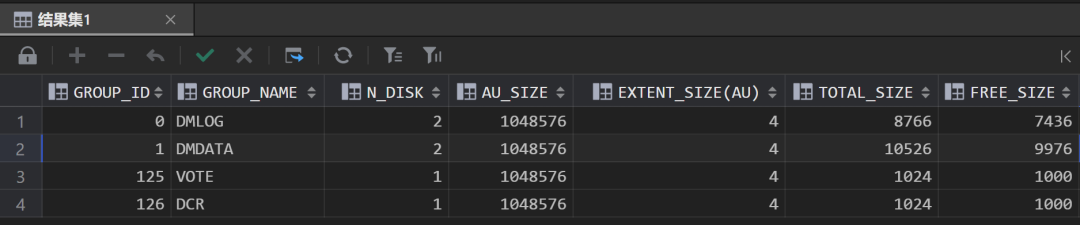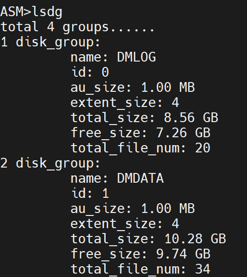 [dmdba@localhost ~]$ dmasmtool DCR_INI=/home/dmdba/dmdsc/dmdcr.iniDMASMTOOL V8ASM>lsdg
