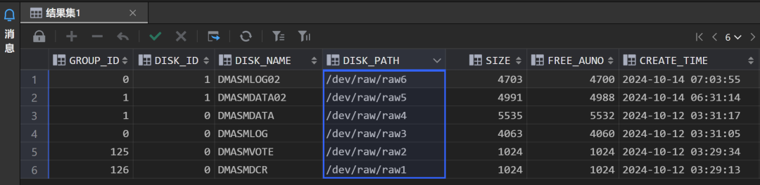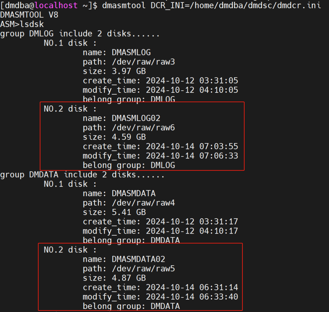 [dmdba@ bin]$ ./dmasmtool dcr_ini=/home/config/dmdcr.iniDMASMTOOL V8ASM>alter diskgroup 'DMDATA' add asmdisk '/dev/raw/raw5'ASM>alter diskgroup 'DMLOG' add asmdisk '/dev/raw/raw6'
