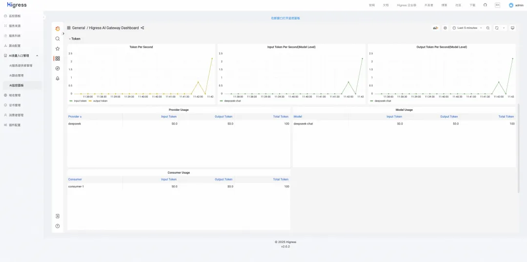 可以在监控面板看到每个模型,以及每个消费者的 token 消耗情况以及调用延时: