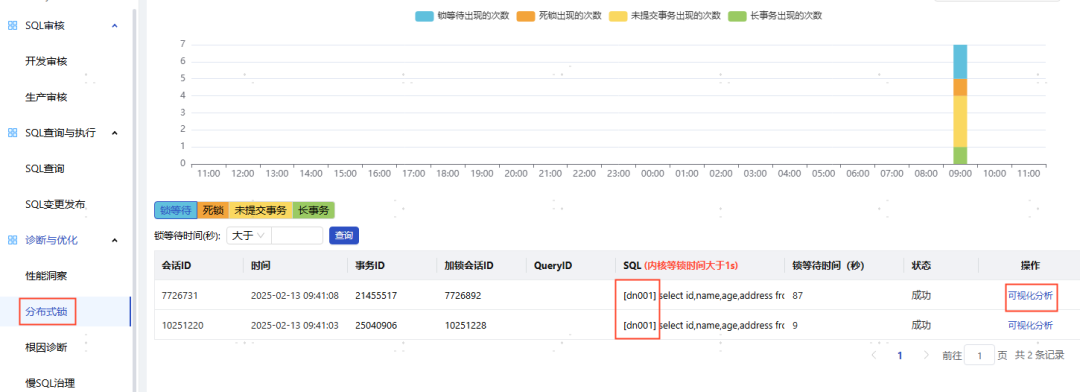 点击锁等待、死锁等功能进行可视化分析,可以进一步直观的查看引起分布式锁问题的相关事务的执行细节。