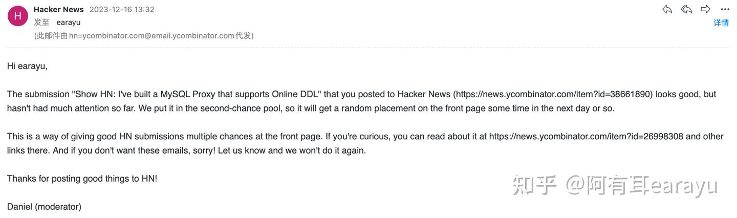HN 里有一个很有意思的频道叫 Show HN,用来展示你做的项目或新工具。我曾经发过一篇《Show HN: I’ve built a MySQL Proxy that supports Online DDL》,最开始没引起任何流量,后来意外收到 HN 管理员发来的邮件,说他们把我的帖子放进了一个“二次推荐池”,会随机再推到首页一把。果然,隔天帖子真的被推到首页,获得了大量关注。