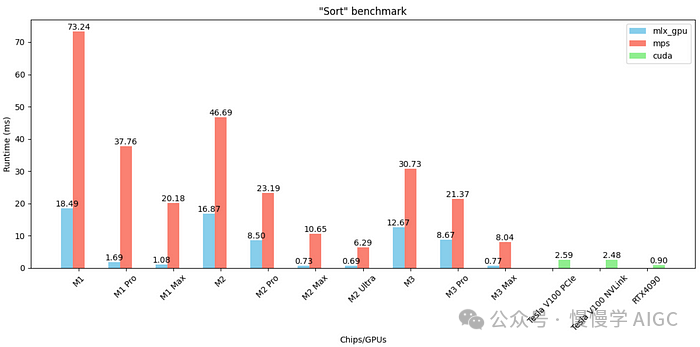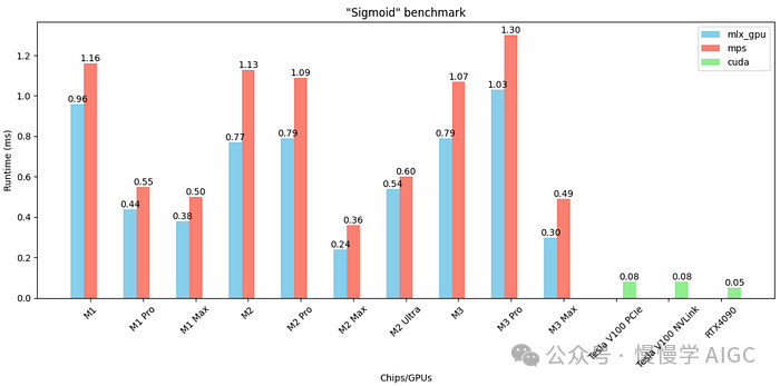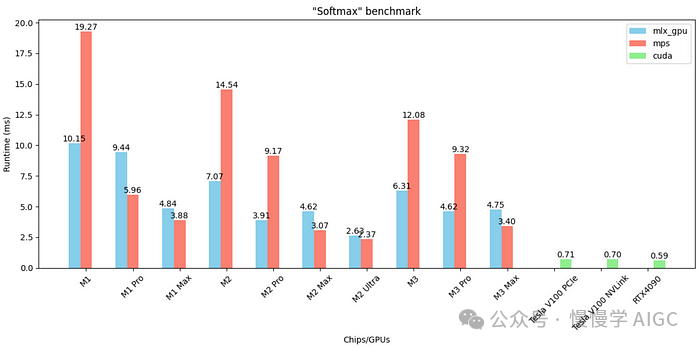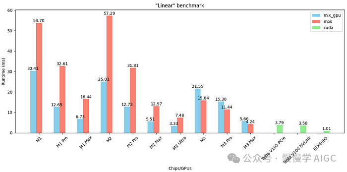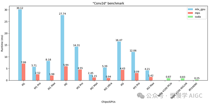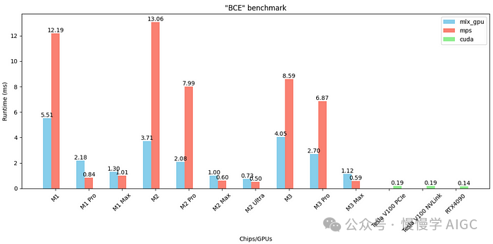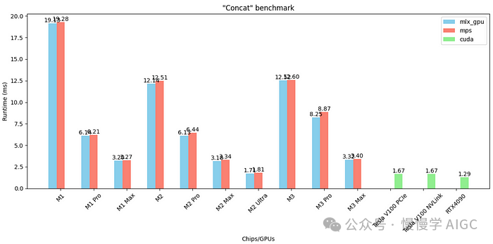 对于每个基准测试,运行时间以毫秒为单位测量。MPS 和 CUDA 基准都使用 PyTorch 中实现的 op,而苹果 M 芯片基准使用 MLX 的 op。
