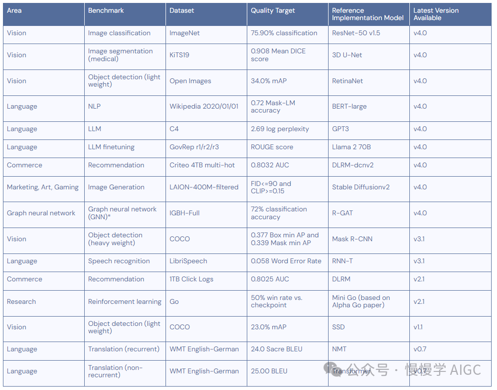 每个基准测试都由一个数据集和质量目标来定义。下表总结了本套件版本中的基准测试。规则仍然是官方权威来源。