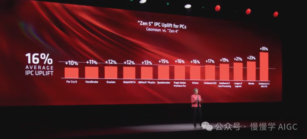 与 Zen 4 相比,在广泛的应用程序基准测试和游戏中,指令每周期性能(IPC)平均提高了 16%。