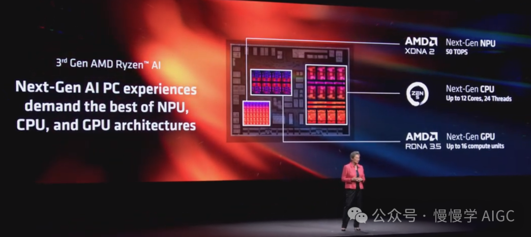 要实现所有这些,我们实际上需要更出色的AI硬件。这就是第三代 Ryzen AI 处理器的用武之地。新的 Ryzen AI 系列在计算和 AI 性能方面有了重大提升,为协作 PC 设定了新标准。Strix 是面向超薄和高端笔记本电脑的下一代处理器,它结合了 AMD 新的 Zen 5 CPU、更快的 RDNA 3.5 显卡和新的 XDNA 2 NPU。